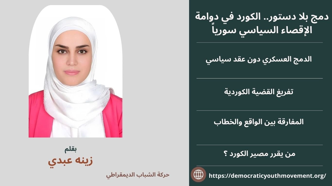 المركزية، غياب الاعتراف الدستوري وحوار وطني جامع وعقد اجتماعي لا يمثل الشعب، جميعها تعكس شكلاً ومضموناً إعادة صناعة وصياغة الهيكل القديم للاستبداد العفلقي الذي يستبعد القضية الكوردية ويرفض معالجة مطالب الكورد التاريخية عبر قناع جديد الذي يضع الكورد في مرحلة تأكيد تام لإقصائهم على نحوٍ أقل هرجاً وهياجاً. السؤال الذي يطرح نفسه، كيف يمكن دمج قوة تمثل شعب بأكمله، دون الاعتراف الحقيقي بقضيته؟